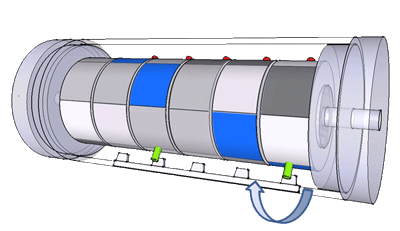 You now have to make a sequence of moves following a simple code. The five moving wheels are numbered 1 to 5 as shown, U means Up or push away from you, D means Down or pull towards you. A move such as 123D means you find a row where only wheels 1, 2 and 3 have a pin, and you pull those three wheels Down one space. The moves 123D and 25U are shown here.